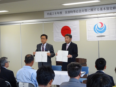 本日、菊池川河川事務所管内における災害時等応急対策に関する基本協定の締結式が執り行われました。